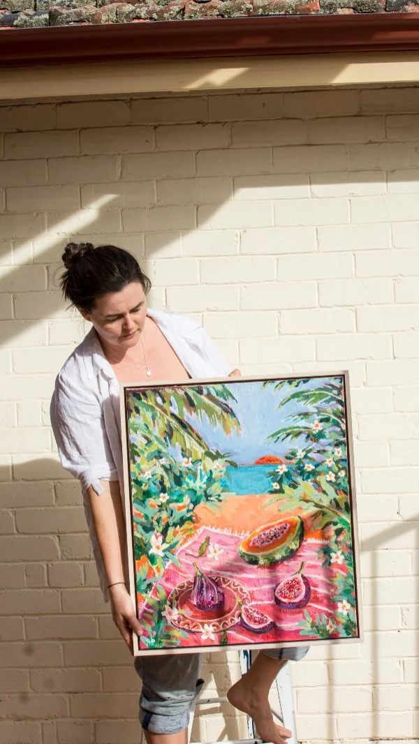 I work across both original artwork creation and pattern design/illustration. With a deep fascination for the alchemy of paint and pattern, I create eclectic, textural pieces that explore themes of colour, place, and nostalgia. My inspiration comes from time spent outdoors, the beauty of Australia’s natural landscapes, and the memories of summer days and travels abroad. I believe inspiration is a wild and unpredictable force—the magic happens when we stay open to its spontaneous nature as it ebbs and flows.